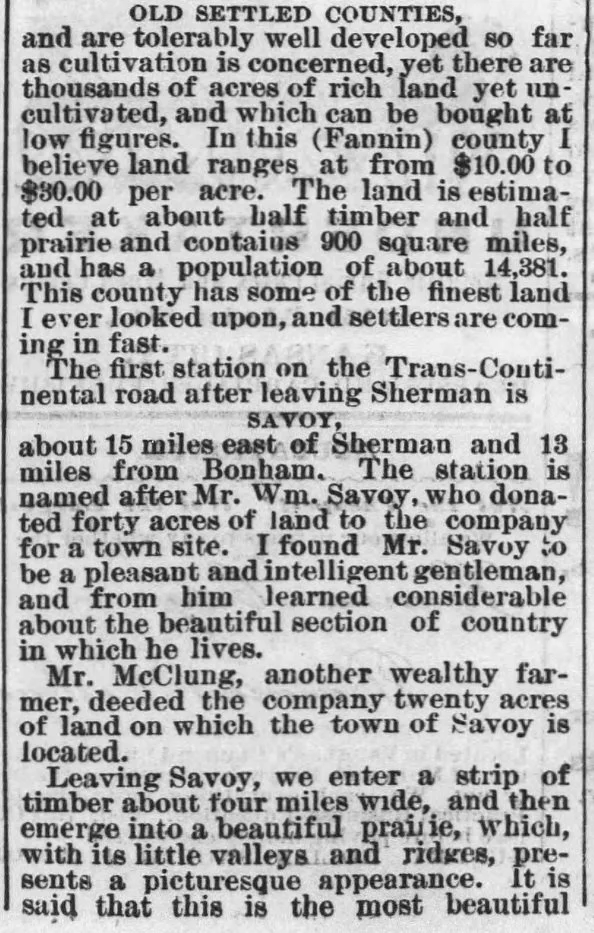 The first station on the Trans-Continental raod after leaving Sherman is SAVOY, about 15 miles east of Sherman and 13 miles from Bonham. The station is named after Mr. Wim. Savoy, who donated forty acres of land to the company for a town site. I found Mr. Savoy to be a pleasant and intelligent gentleman, and from him learned considerable about the beautiful section of country in which he lives.