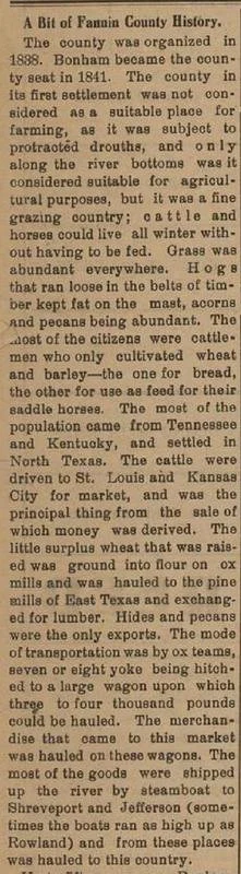 The county was organized in 1838. Bonham became the county seat in 1841. The county in its first settlement was not considered as a suitable place for farming, as it was subject to protracted drouths, and only along the river bottoms was it considered suitable for agricultural purposes, but it was a fine grazing country; cattle and horses could live all winter without having to be fed. Grass was abundant everywhere. Hogs that ran loose in the belts of timber kept fat on the mast, acorns and pecans being abundant. The most of the citizens were cattlemen who only cultivated wheat and barley—the one for bread, the other for use as feed for their saddle horses. The most of the population came from Tennessee and Kentucky, and settled in North Texas. The cattle were driven to St Louis and Kansas City for market and was the principal thing from the sale of which money was derived. The little surplus wheat that was raised was ground into flour on ox mills and was hauled to the pine mills of East Texas and exchanged for lumber. Hides and pecans were the only exports. The mode of transportation was by ox teams, seven or eight yoke being hitched to a large wagon upon which three to four thousand pounds could be hauled. The merchandise that came to this market was hauled on these wagons. The most of the goods were shipped up the river by steamboat to Shreveport and Jefferson (sometimes the boats ran as high up as Rowland) and from these places was hauled to this country.