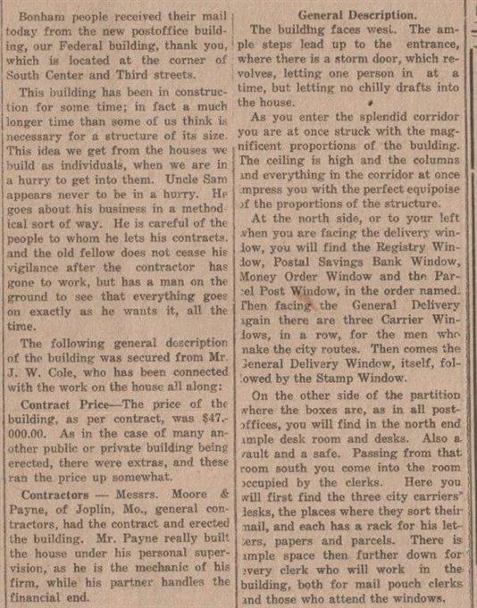 Construction began on the current Post Office building in Bonham in 1912 and it opened for business on March 2, 1914. On the evening of Saturday, February 28, 1914, a reception was held at the new post office for the citizens of Bonham, and about 1,000 people attended.