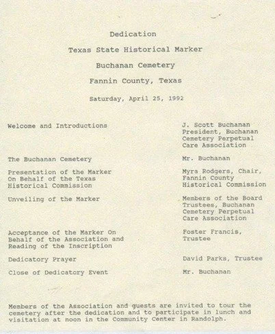 A pioneer family to the Republic of Texas, Alexander (1796-1845) and Delilah Duncan (1806-1870) and their 11 children, came to Fannin County from Morgan County, Illinois, in 1844 and purchased a 320 acre farm about one mile southwest of Randolph from Nathen H. Hampton for $800. A legal document concerning the sale of the property is on file at the Fannin County Courthouse and serves as proof for Buchanan family descendants who want to qualify for membership in the Daughters of the Republic of Texas (DRT) or the Sons of the Republic of Texas (SRT).