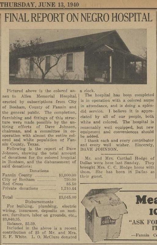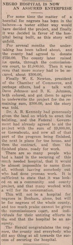 This will not be a hospital for negroes in Bonham, alone, but will be for negroes of the whole county, and too much praise cannot be given the commissioners court, and individuals for their untiring efforts to the end that the hospital be an assurety.