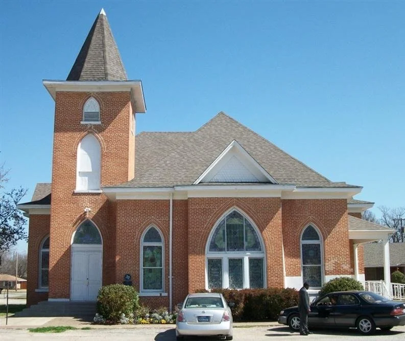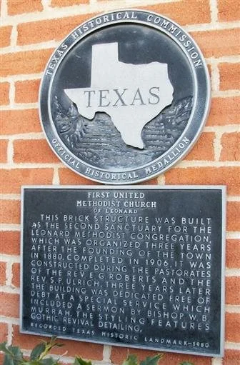 This brick structure was built as the second sanctuary for the Leonard Methodist congregation, which was organized three years after the founding of the town in 1880. Completed in 1906, it was constructed during the pastorates of the Rev. E. G. Roberts and the Rev. S. P. Ulrich. Three years later the building was dedicated free of debt at the special service which included a sermon by Bishop W. B. Murrah. The styling features Gothic Revival detailing.