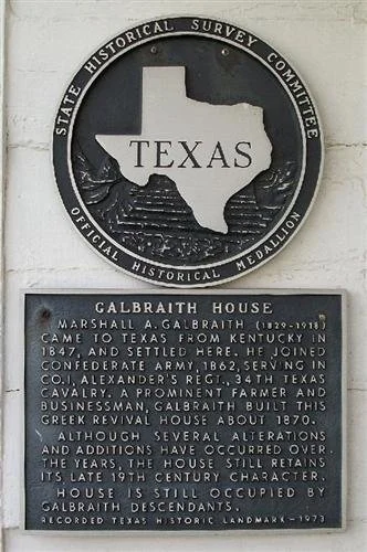 Marshall A. Galbraith (1828-1918) came to Texas from Kentucky in 1847 and settled here. He joined Confederate Army, 1862, serving in Vol. Alexander's Regiment, 34th Texas Cavalry. A prominent farmer and businessman, Galbraith built this Greek revival house about 1870. Although several alterations and additions have occurred over the years, the house still retains its late 19th century character. House is still occupied by Galbriath descendants.