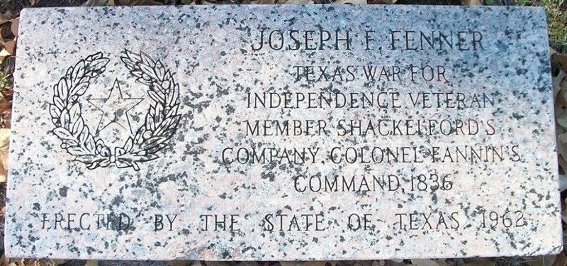 This marker, erected by the State of Texas in 1962 in the Grove Hill Cemetery, honors Joseph F. Fenner and states: