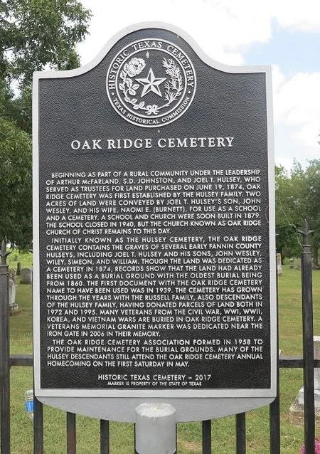 Initially known as the Hulsey Cemetery, the Oak Ridge Cemetery contains the graves of several early Fannin County Hulseys, including Joel T. Hulsey and his sons, John Wesley, Wiley, Simeon, and William. Though the land was dedicated as a cemetery in 1874, records show that the land ha already been used as a burial ground with the oldest burial being from 1860. The first document with the Oak Ridge Cemetery nae to have been used was in 1939. The Cemetery has grown through the years with the Russell family, also descendants of the Hulsey family, having donated parcels of land both in 1972 and 1995. Many veterans from the Civil War, WWI, WWII, Korea, and Vietnam Wars are buried in Oak Ridge Cemetery. A veterans memorial granite marker was dedicate near the iron gate in 2006 in their memory.