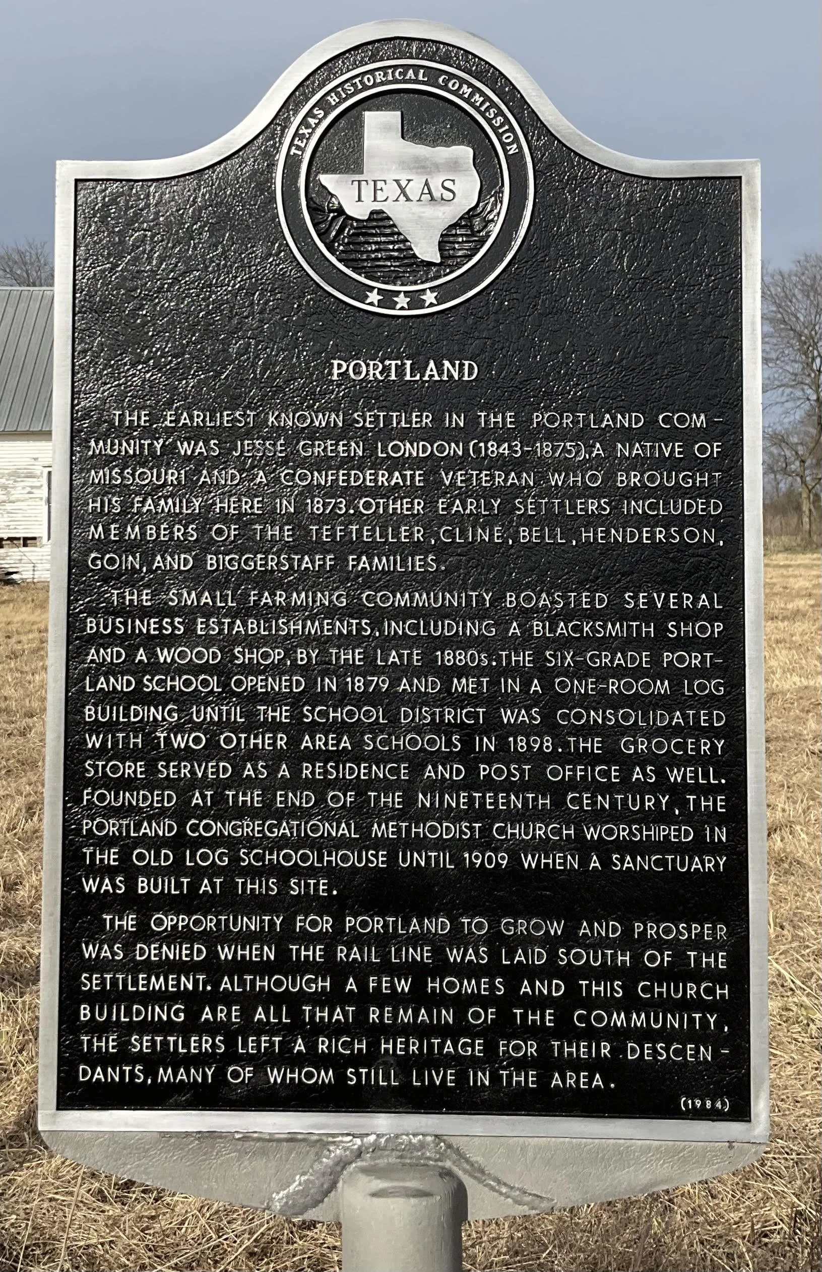 The original title to the land in this area was held by the University of Texas. In 1872 or 1873 Jesse Green London, one of the settlers in the Portland Community, bought a tract of land from the University of Texas. This land was part of the tract which came to be known as the L. B. Tefteller homeplace, now owned by Mrs. Margaret Hale McLeod. The house on this place is one of four landmarks still visible in the Portland Community. The others are the T. O. London home, Portland Church and the Ben Smith house.