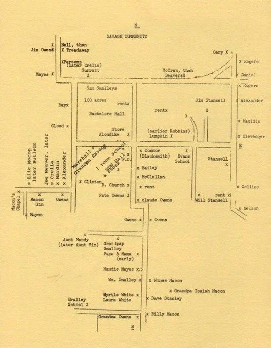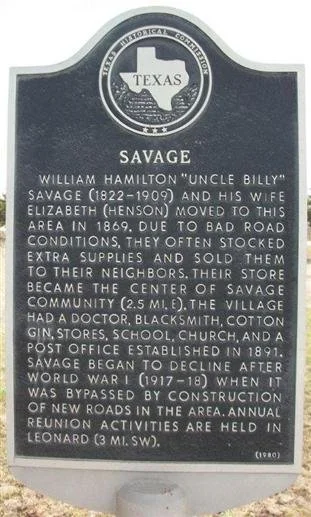 William Hamilton "Uncle Billy" Savage (1822-1909) and his wife Elizabeth (Henson) moved to this area in 1869. Due to bad road conditions, they often stocked extra supplies and sold them to their neighbors. Their store became the center of the Savage Community (25 mi.E). The village had a doctor, blacksmith, cotton gin, stores, school, church, and a post office established in 1891. Savage began to decline after World War I (1917-18) when was bypassed by construction of new roads in the area. Annual reunion activities are held in Leonard (3 mi. SW).